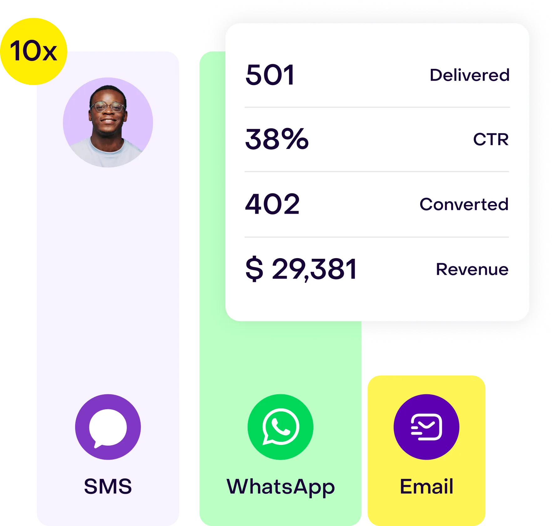 Launch text-based campaigns that outperform emails, with up to 10x more revenue generation.